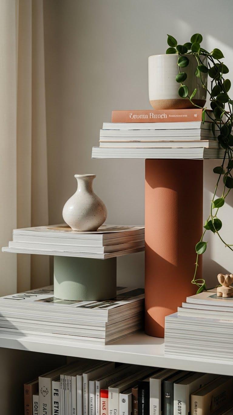 You’ll combine stacked magazines with horizontal book stacks to elevate vases or plants. Tuck in airy, layered ceramics and a single trinket for balance.