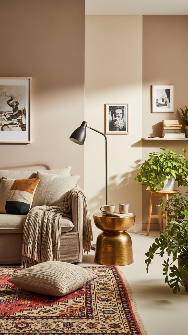 You’ll layer beiges and textures, mixing layered beiges with brass, matte black, or lively plants to refresh freely.