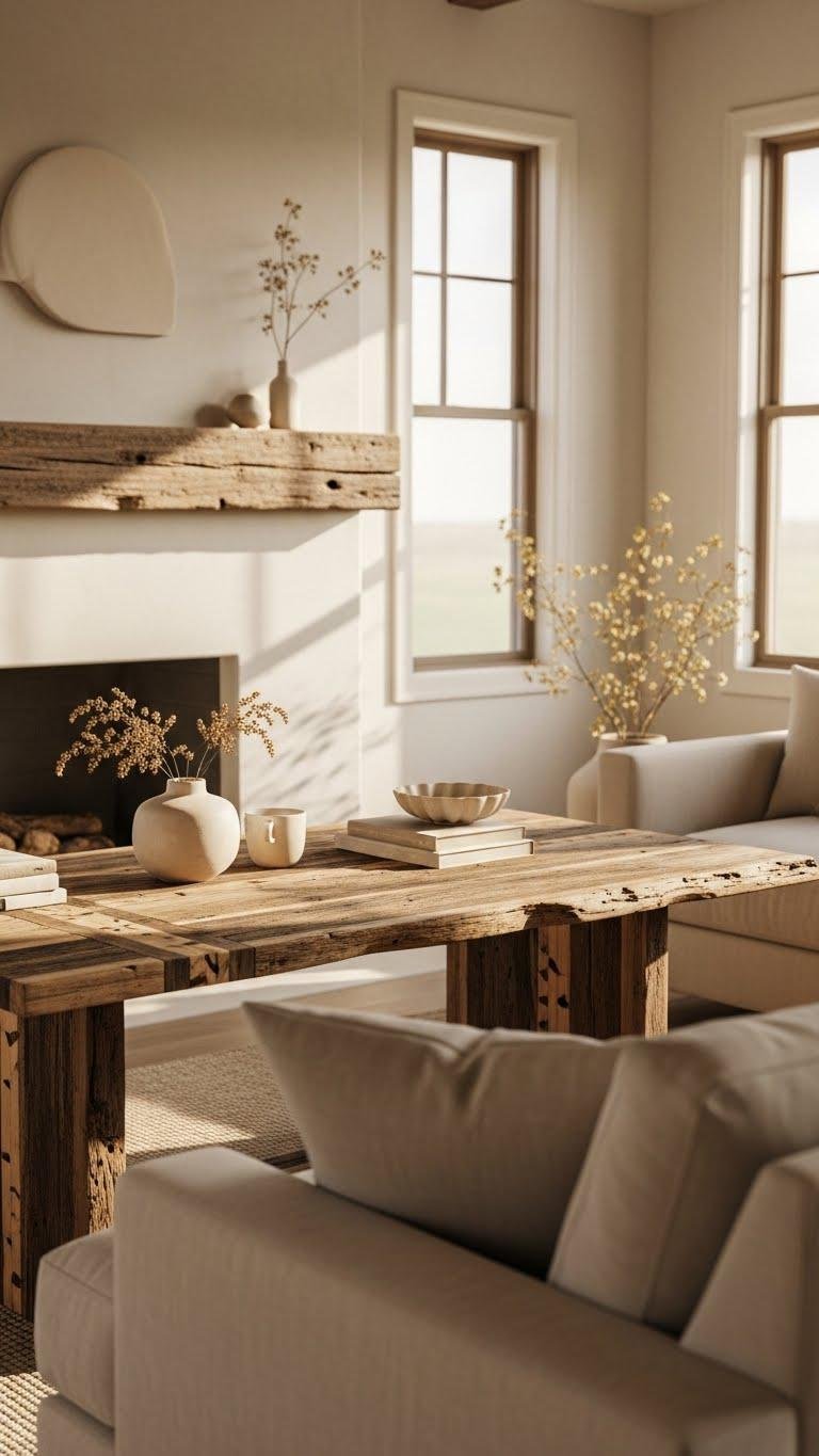 Warm neutrals give you a calm canvas, and reclaimed wood furniture adds the tactile, storied anchor that brings the room to life.