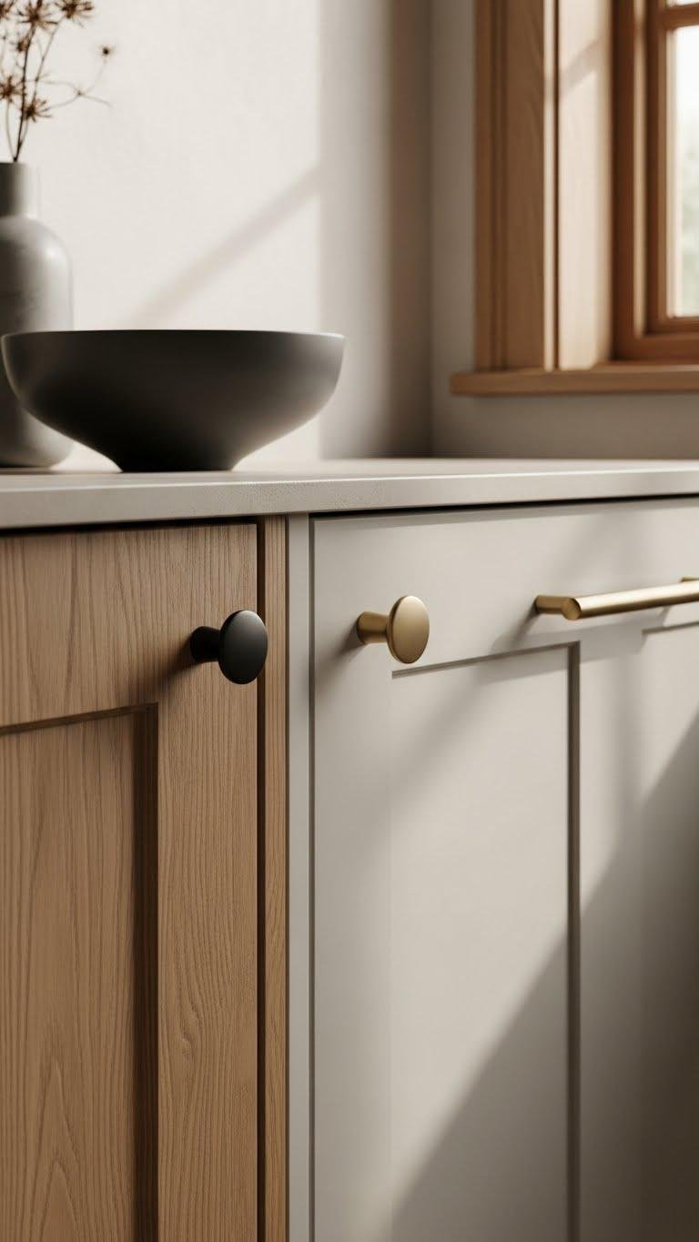 Because high-gloss hardware can read dated or flashy, matte and low-sheen finishes give your space a quietly modern edge that feels intentional rather than showy. You’ll create subtle matte contrast by pairing black or brushed metals with soft woods and neutrals. Choose low sheen fixtures to let materials and form sing, so your rooms feel liberated, calm, and unmistakably yours.