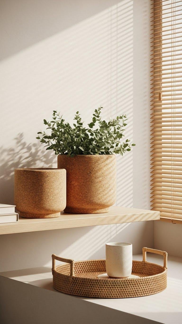 You’ll love how cork planters, woven rattan trays, and slim bamboo blinds layer natural tones without feeling fussy.