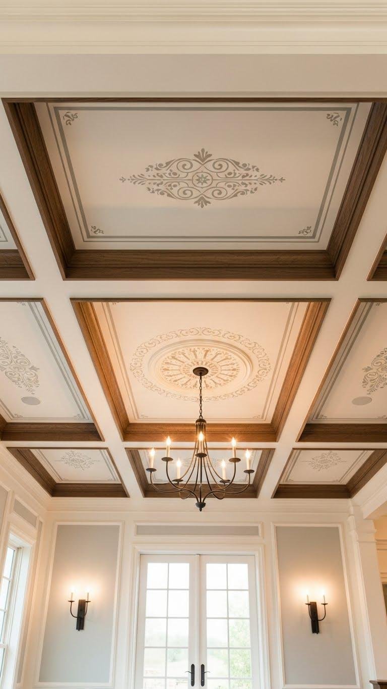 When you look up, don’t treat the ceiling as an afterthought—turn it into the room’s “fifth wall” with paint, texture, or architectural detail that anchors the whole space. You’ll choose a coffered ceiling for depth, add painted beams for warmth, or install statement medallions to elevate fixtures.