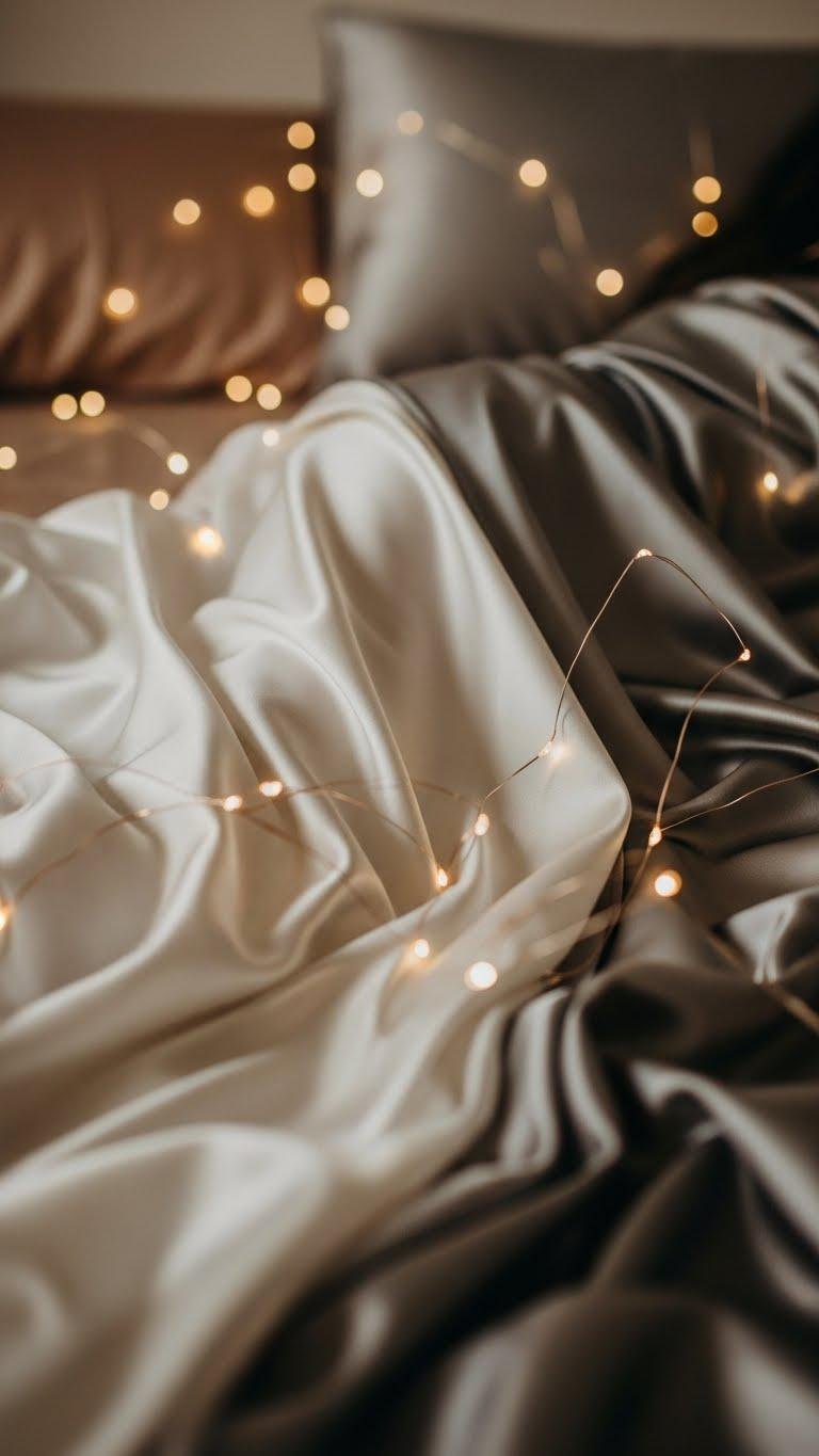 After the fairy lights soften the room, slide into satin sheets in soft neutrals to amplify that glow—silky cream, muted blush, or dove gray will reflect the amber pinpoints and make every movement feel indulgent.