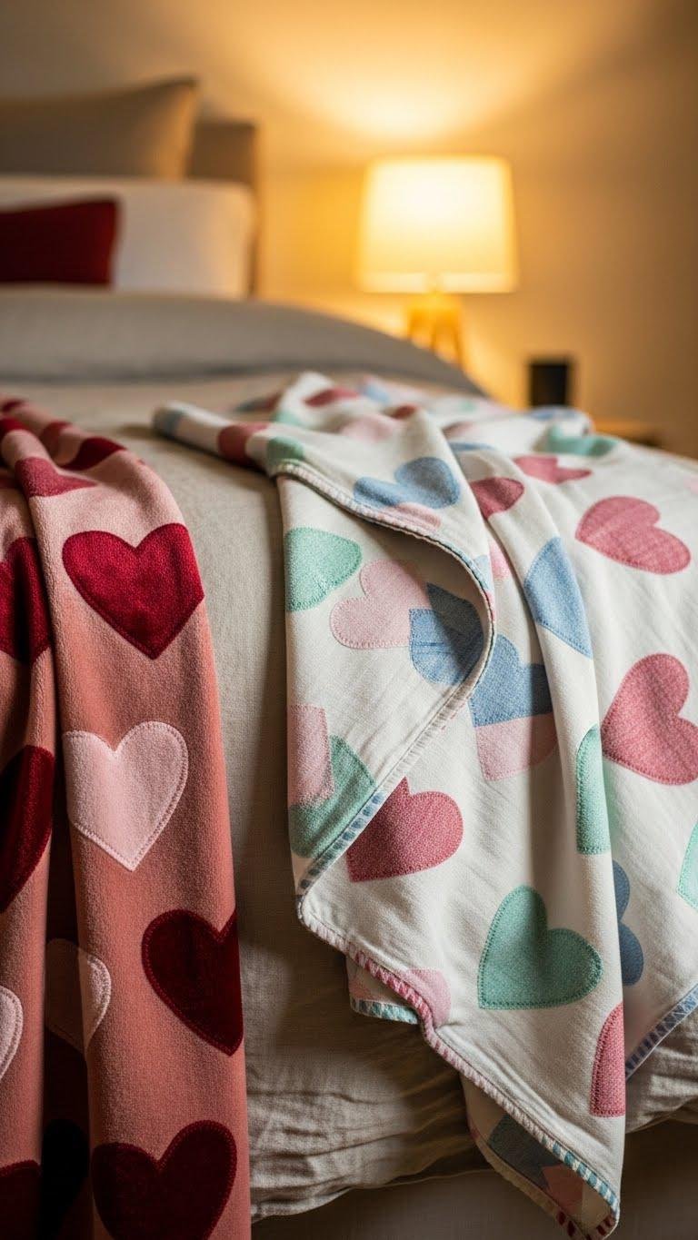When you drape a plush velvet throw patterned with soft hearts across the foot of your bed, the room instantly feels curated and sensual; cotton options bring the same motif into a lighter, more breathable palette for daytime lounging. You’ll choose hand stitched detailing, reversible pattern choices for versatile styling, and expect hypoallergenic, machine washable fabrics that let you express freedom without fuss.