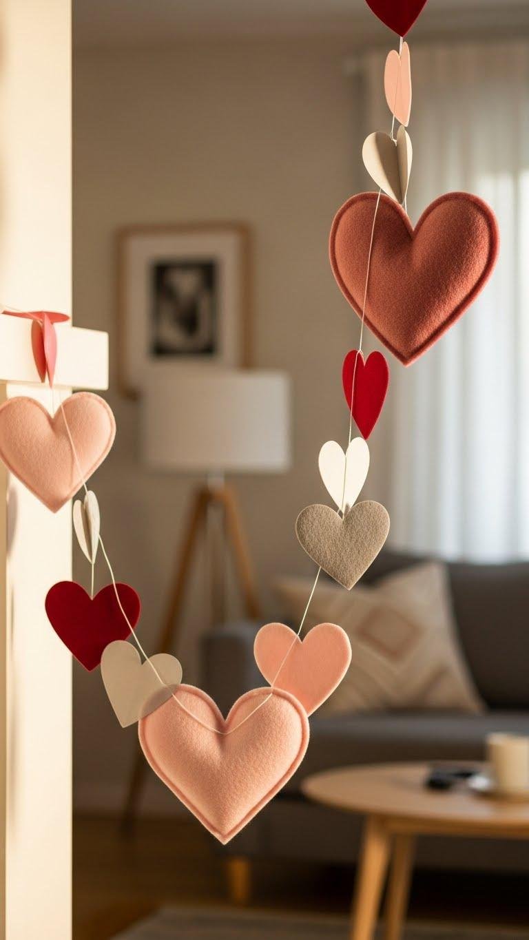 Choose oversized felt hearts for cozy texture or minimalist paper garlands for airy, modern lines. You’ll mix colors, scales, and negative space, letting each piece breathe. Hang low or drape high to create movement that feels spontaneous and liberating.