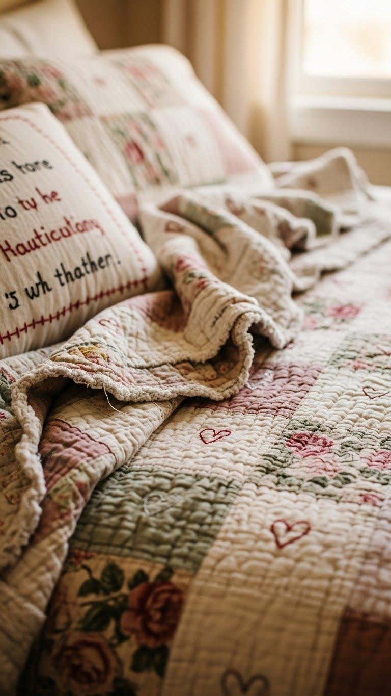 After stitching a personal message into a pillow, bring that same handcrafted warmth to the whole bed with a thrifted vintage quilt dotted with tiny embroidered hearts.