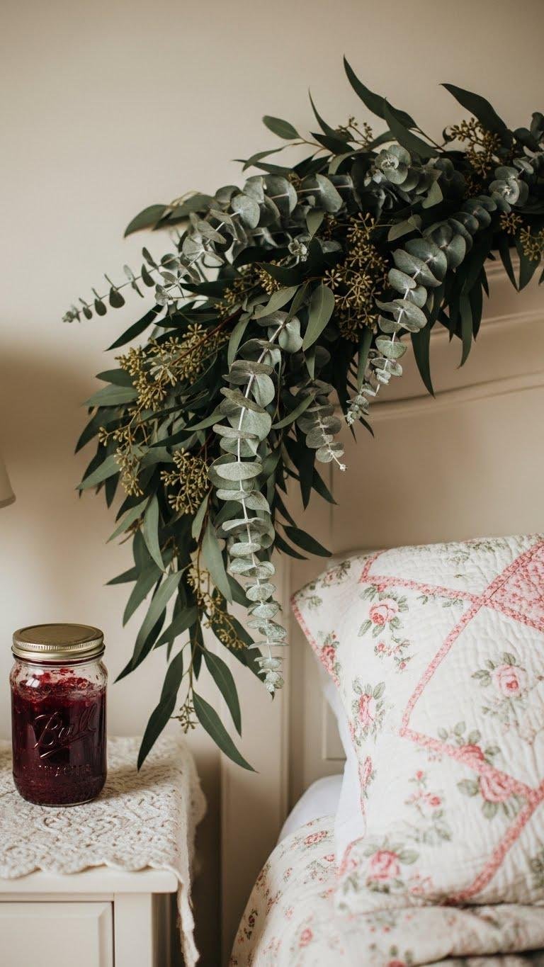 Tucked into a jam jar or draped across the headboard, eucalyptus and sprigs of fresh greenery give the room an instant lift, their silvery-green tones cutting through the quilt’s faded roses and grounding the palette.