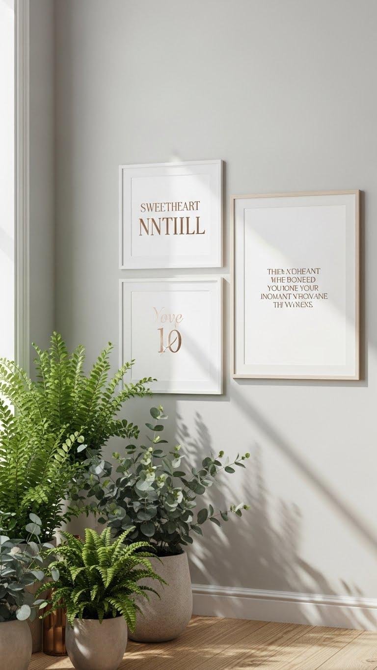 Let the fresh greenery set the scene, then give the wall a personal touch with framed sweetheart initials or a short romantic quote that echoes the room’s soft palette. You’ll pair vintage typography with subtle metallic accents, choosing airy frames and negative space to keep things open. Position pieces at eye level so the sentiment feels intimate, modern, and effortlessly free.