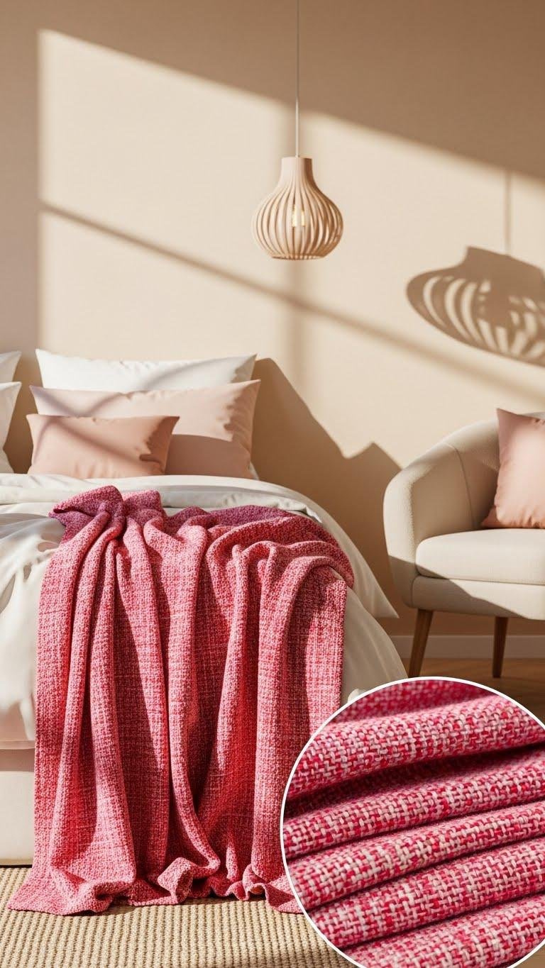 Drape a pink-and-red accent throw over the foot of the bed or an armchair to instantly energize the calm, neutral palette—its saturated hues read like a cheerful punctuation that ties together blush pillows and warm cream linens. You’ll choose a bold blush accent with a textured weave that feels cozy and modern, layering color confidently so the room breathes playful freedom and effortless style.