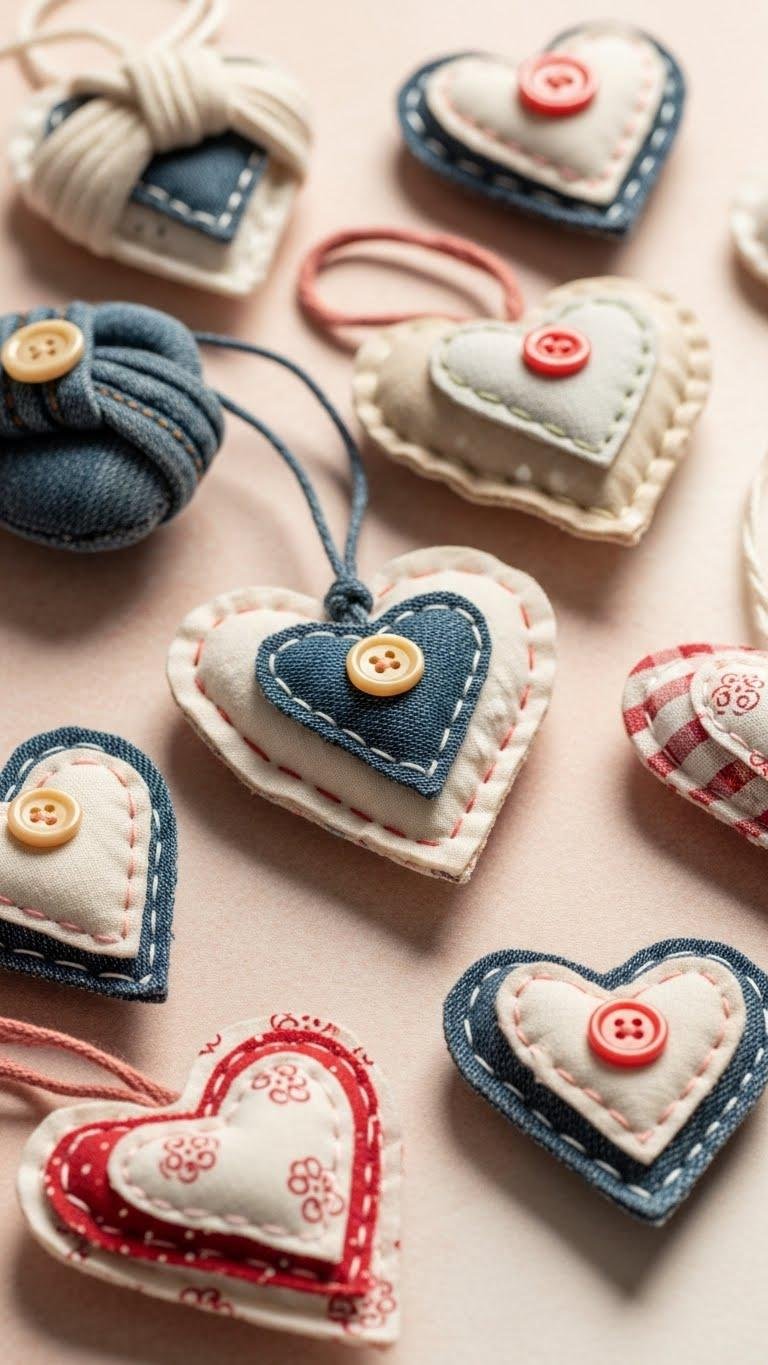 You’ll mix recycled denim with silk or cotton, add scented stuffing, button embellishments, and stamped designs for contrast; hang loose, arrange freeform, and let each heart breathe.