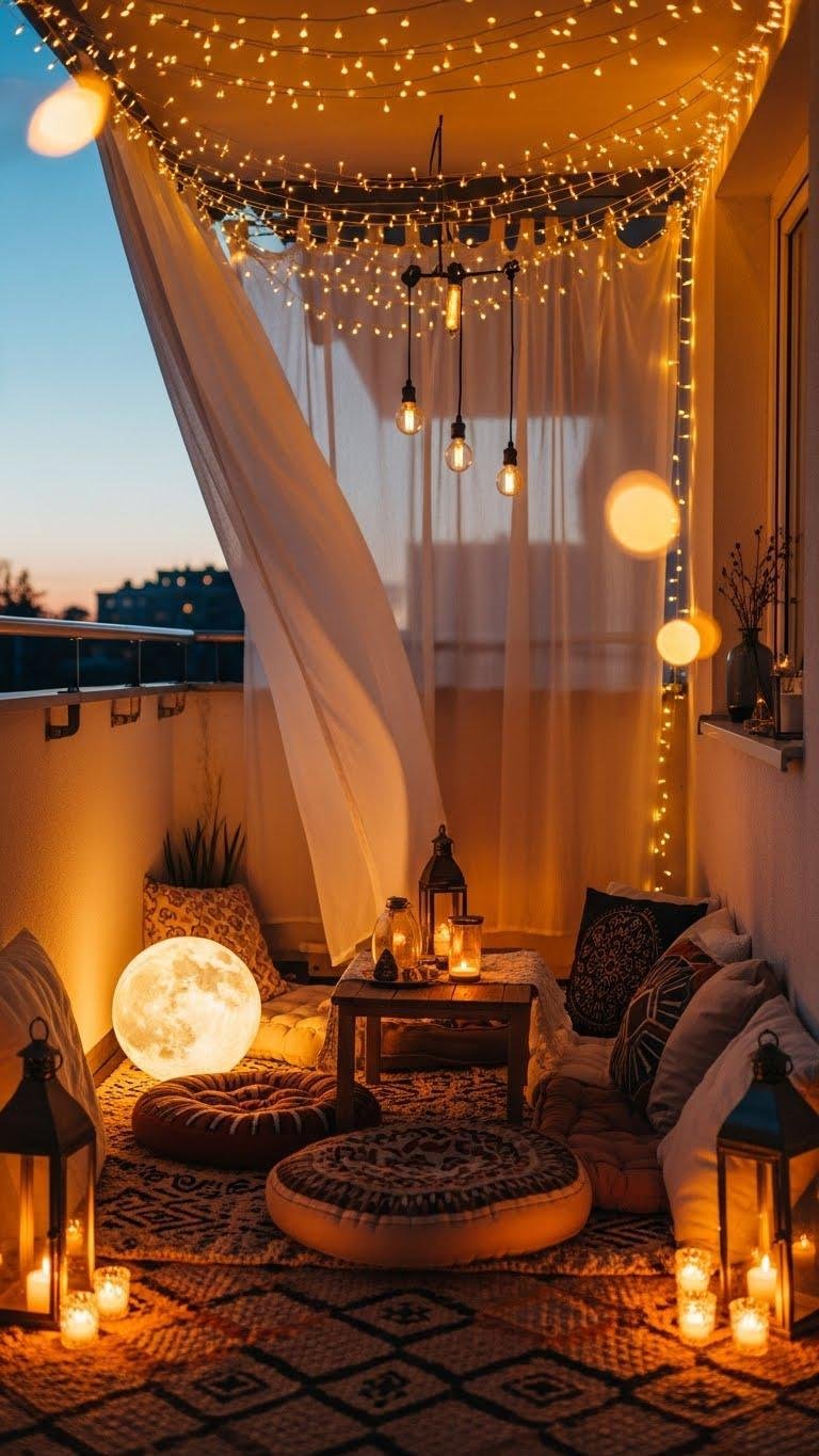 After you’ve finished stitching tiny fabric hearts, step outside and extend that handmade warmth onto your balcony with a string-light canopy that makes evenings feel private and cinematic. You’ll arrange moonlit seating—floor cushions, a low table—and hang gauzy privacy curtains.