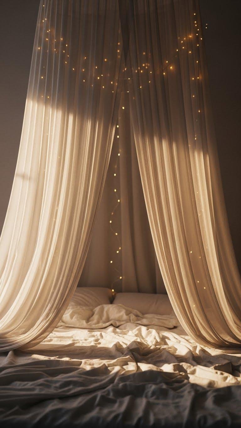 Often you’ll drape a gauzy, floor-length canopy over your bed to create a private, ethereal nook, then weave tiny twinkle lights through the fabric so they glow like captured fireflies. You’ll choose sheer ethereal drapery in soft neutrals, suspend lights overhead for a subtle starry ambiance, and leave panels loose so you can slip in and out, free to linger or depart.