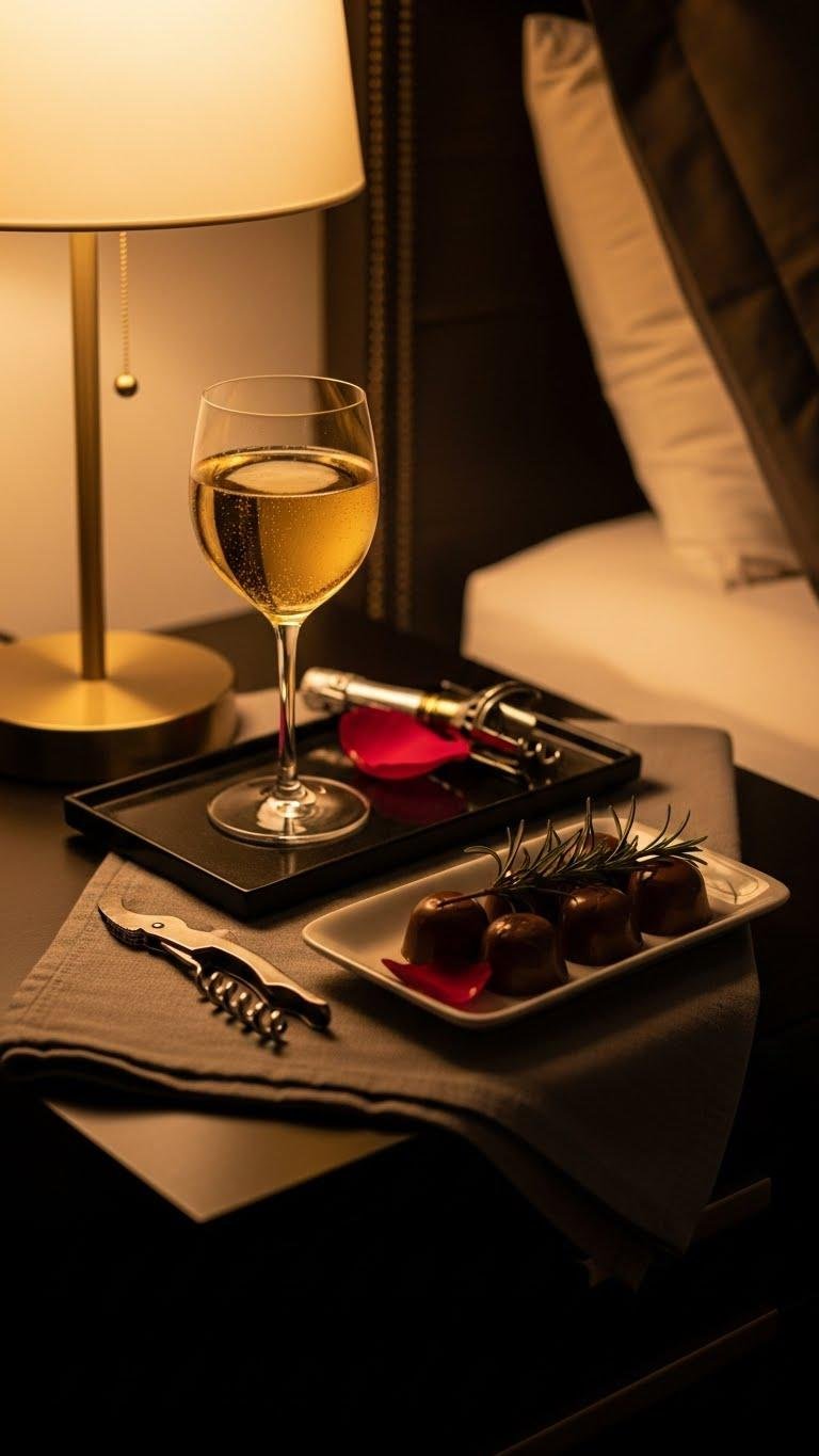 Set a small tray on your nightstand and instantly elevate the room from cozy to celebratory: a chilled coupe of champagne catching the lamp’s amber glow, a few glossy bonbons nestled on a ceramic dish, and a sprig of rosemary or rose petal for a fragrant flourish.