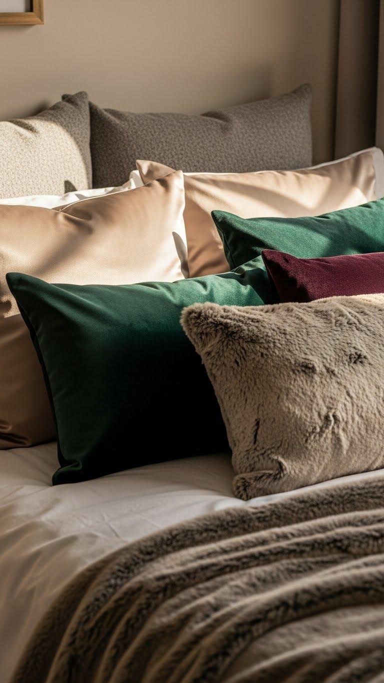 Layered Pillows in Silk, Faux Fur, and Velvet
