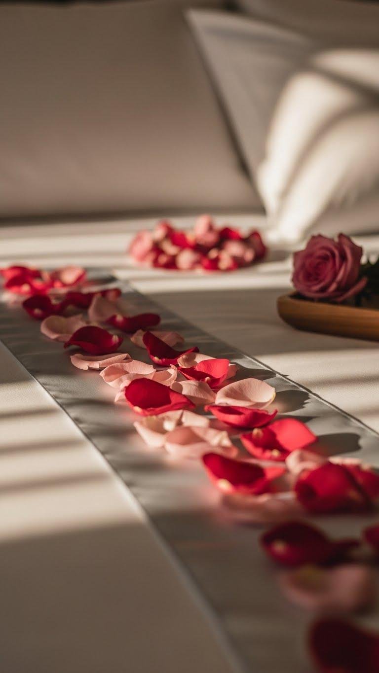 A handful of fresh rose petals scattered across the sheets instantly signals romance—soft, fragrant confetti that reads classic without feeling sentimental. You’ll mix fresh blooms with silk petals along the runner, keeping edges clean and effortless. Sprinkle scented confetti near the pillows and a tray, not everywhere, so the fragrance lingers. The look feels curated, free, and subtly indulgent.