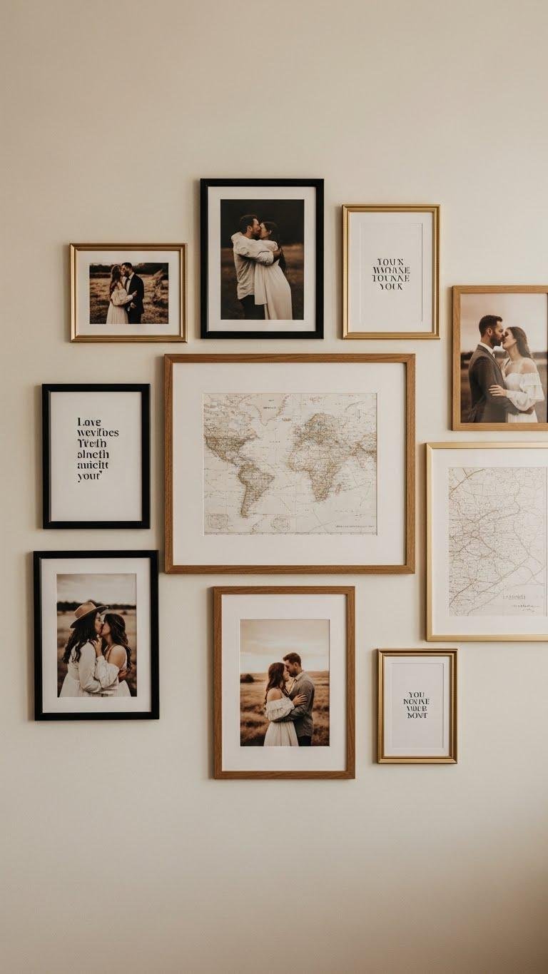Create an intimate gallery wall that tells your story with a curated mix of candid shots, soft-focus portraits, and vintage-inspired prints; arrange frames in varied sizes and finishes—matte black, warm wood, brushed gold—to add texture and modern romance. You’ll mix vintage portraiture with candid closeups, intersperse minimalist quotes or maps, and leave negative space so each image breathes, inviting wandering eyes and liberated memories.
