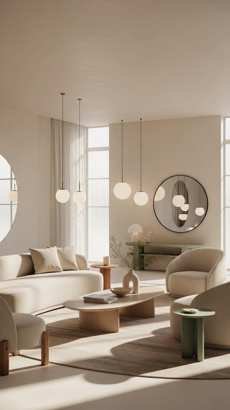You’ll pair those pieces with rounded lighting and curved mirrors to amplify flow, creating a liberated, calm atmosphere.