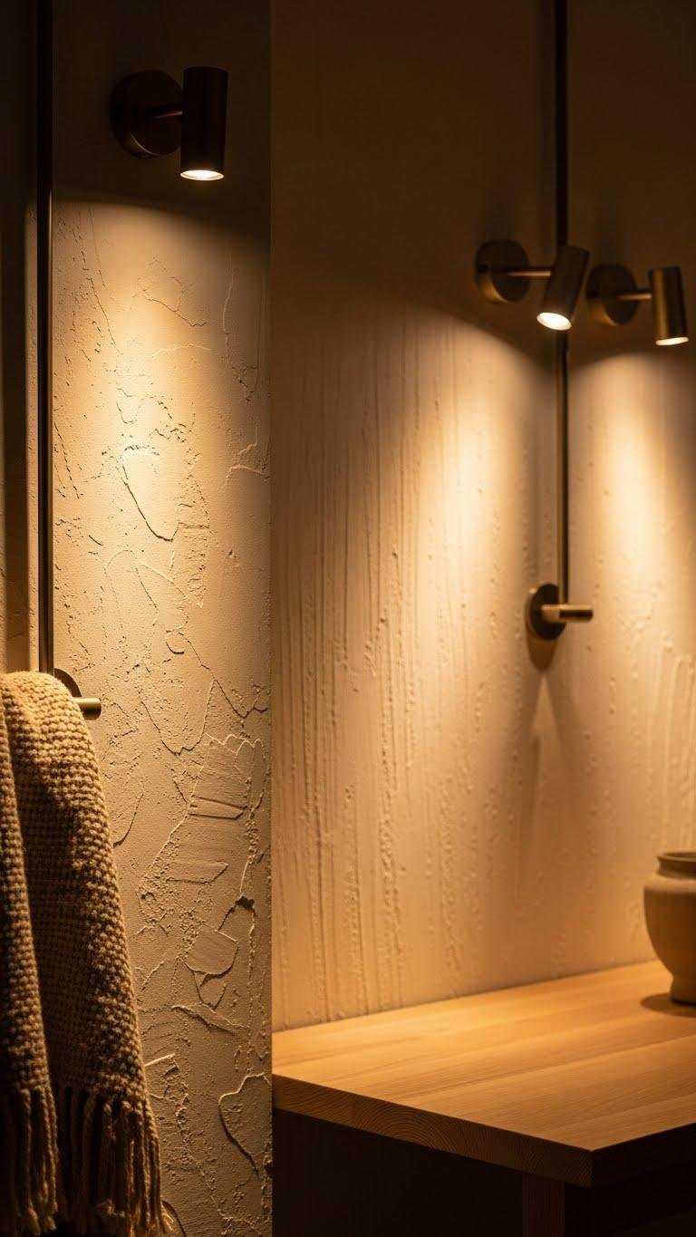 You’ll position low-angle accent lighting to reveal weave, grain and plaster, creating tactile contrast that invites touch without clutter.