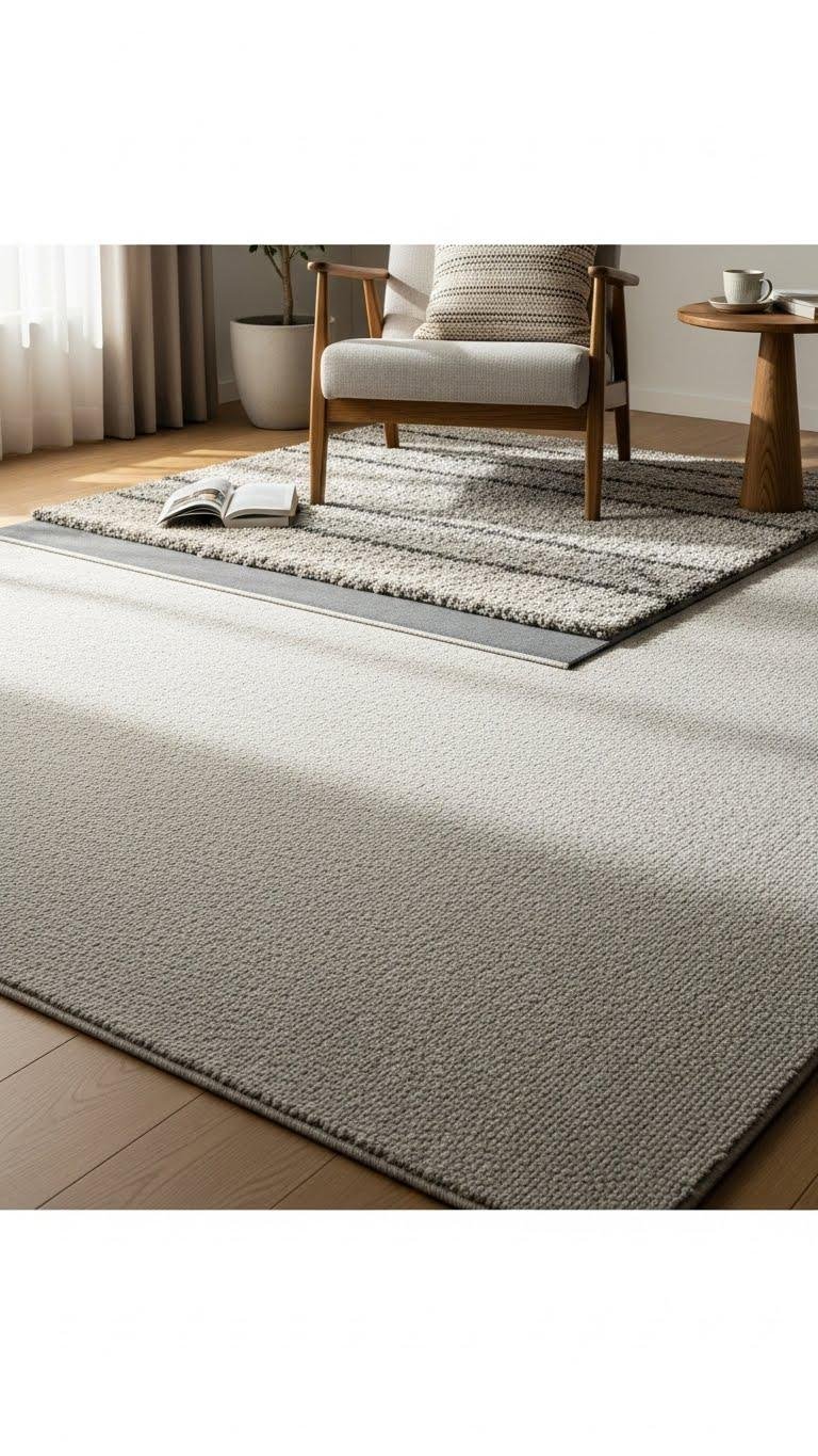 Use a soundproof underlay beneath the base layer, choose neutral tones, and experiment with patterned rug pairs to create rhythm and freedom while keeping the room calm and intentional.
