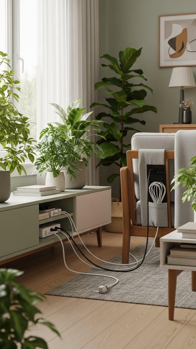 Bringing plants into a room settles the eye, so don’t let cords undo that calm. Tuck cables into hidden channels behind furniture, run power strips under consoles, and bundle loose wires with sleek cord sleeves.