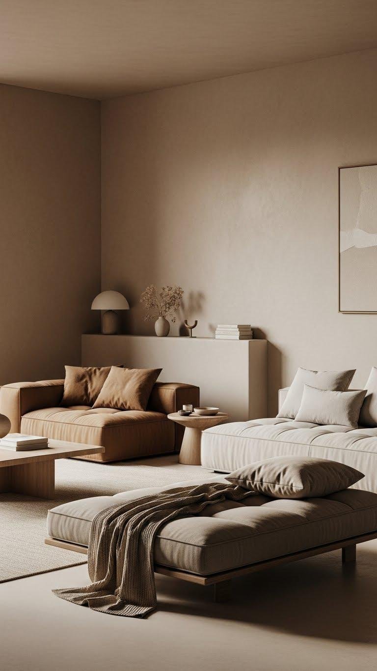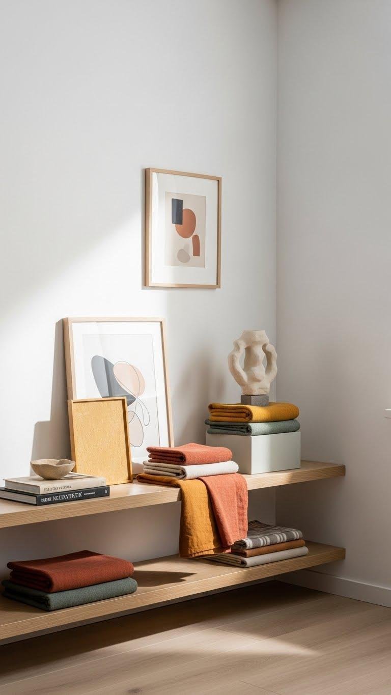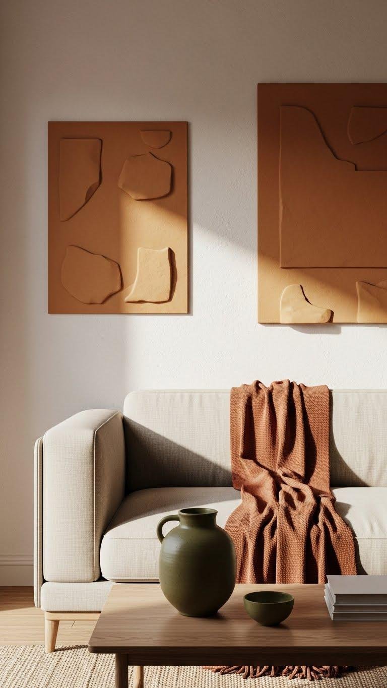 Use earthy contrasts to give depth: a single clay vase, a throw, or framed art.