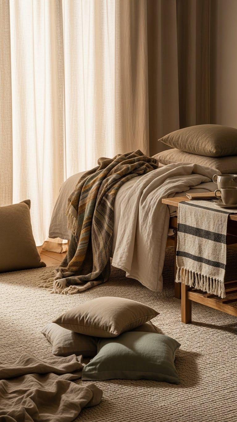 Layering natural textiles brings immediate tactile warmth to a room, so start with a simple hierarchy: large, breathable pieces (linen or cotton curtains and a wool rug), mid-scale items (woven throws and cotton-linen bedding), then small accents (hemp or silk cushions, a handwoven table runner). You’ll favor organic dyeing, mix textures confidently, and use thermal layering to create effortless, intentional comfort that frees movement.
