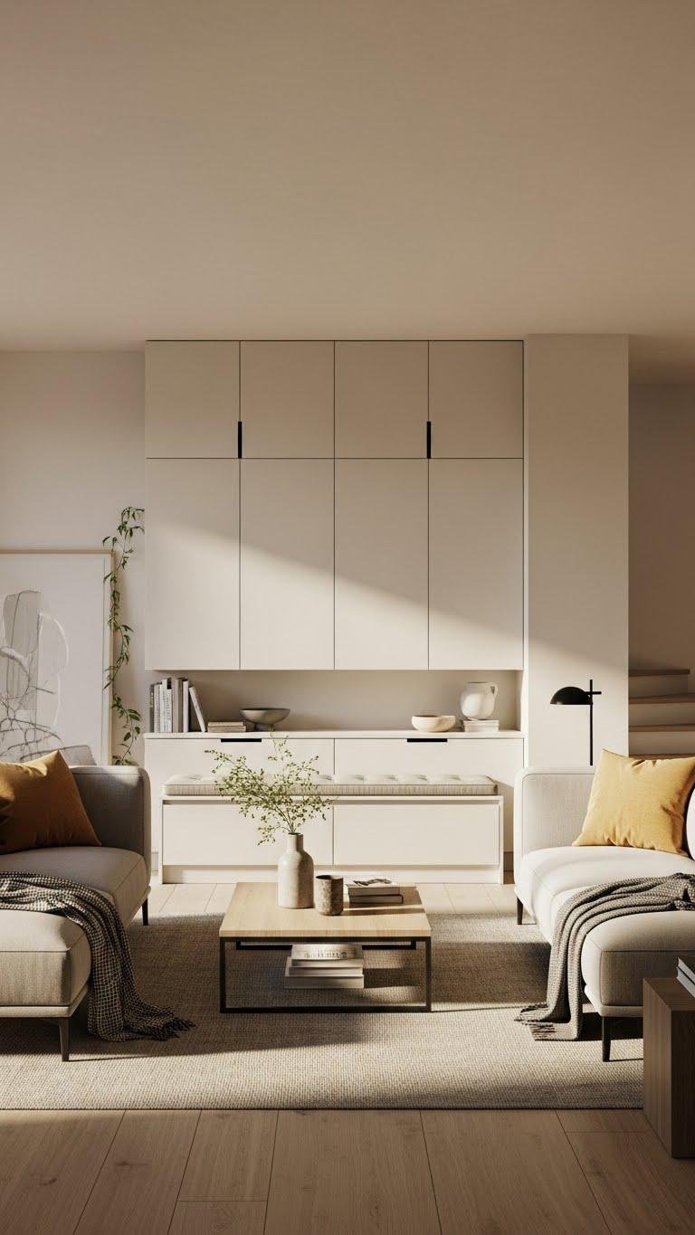 After anchoring the room with low-profile seating, keep the calm by hiding clutter out of sight—closed storage helps maintain those clean sightlines and the airy feel you’ve created.