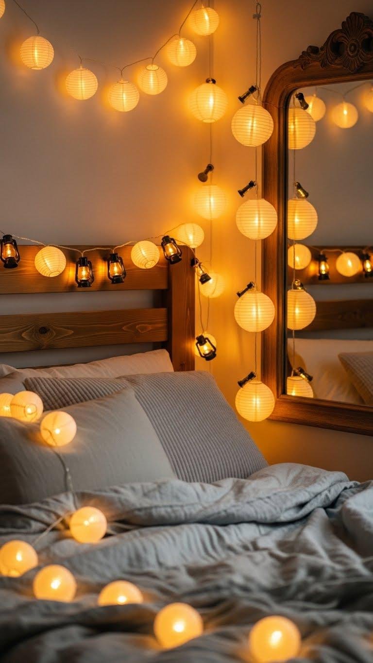 You’ll string battery powered lanterns along a headboard, hang paper lanterns in corners, and layer strands over mirrors.