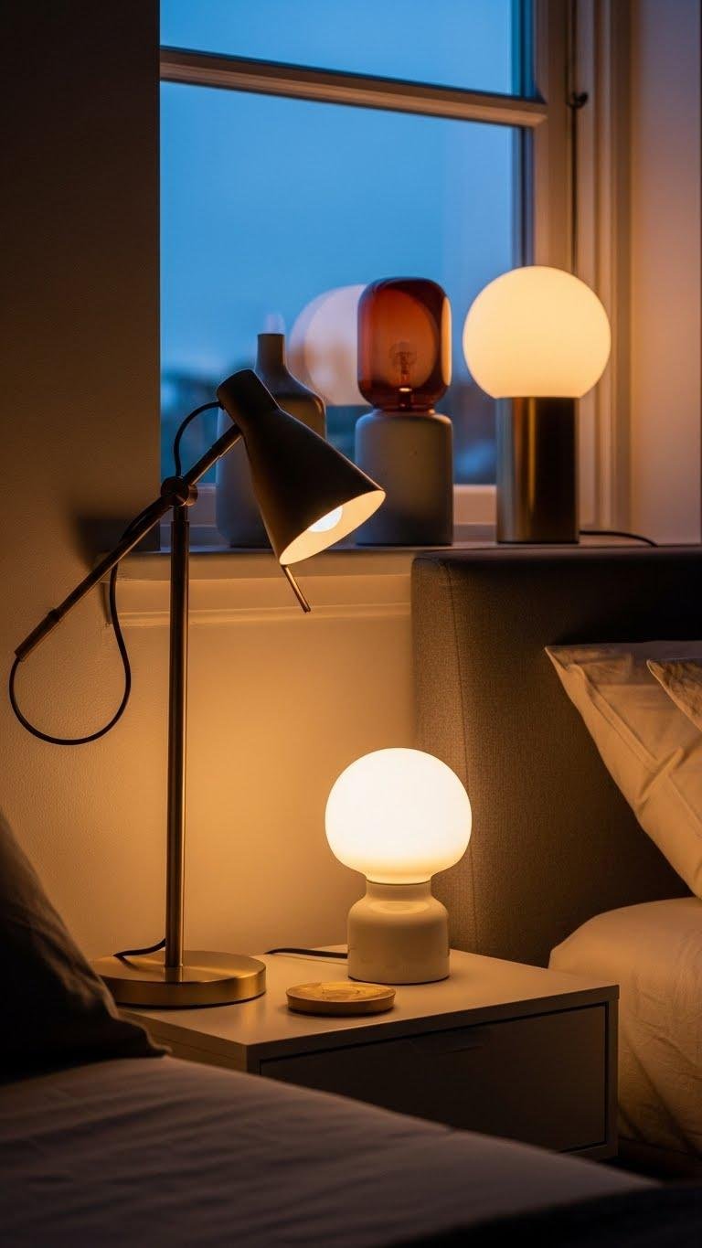 Layer in bedside lamps to balance task light and mood without cluttering your nightstand — mix a focused reading lamp with a softer, lower-watt bedside fixture so you can switch from work to unwind in seconds. Choose pieces with adjustable shades and varied bases to create layered heights; you’ll gain control, sculpted ambiance, and the freedom to read, relax, or rise without harsh glare.