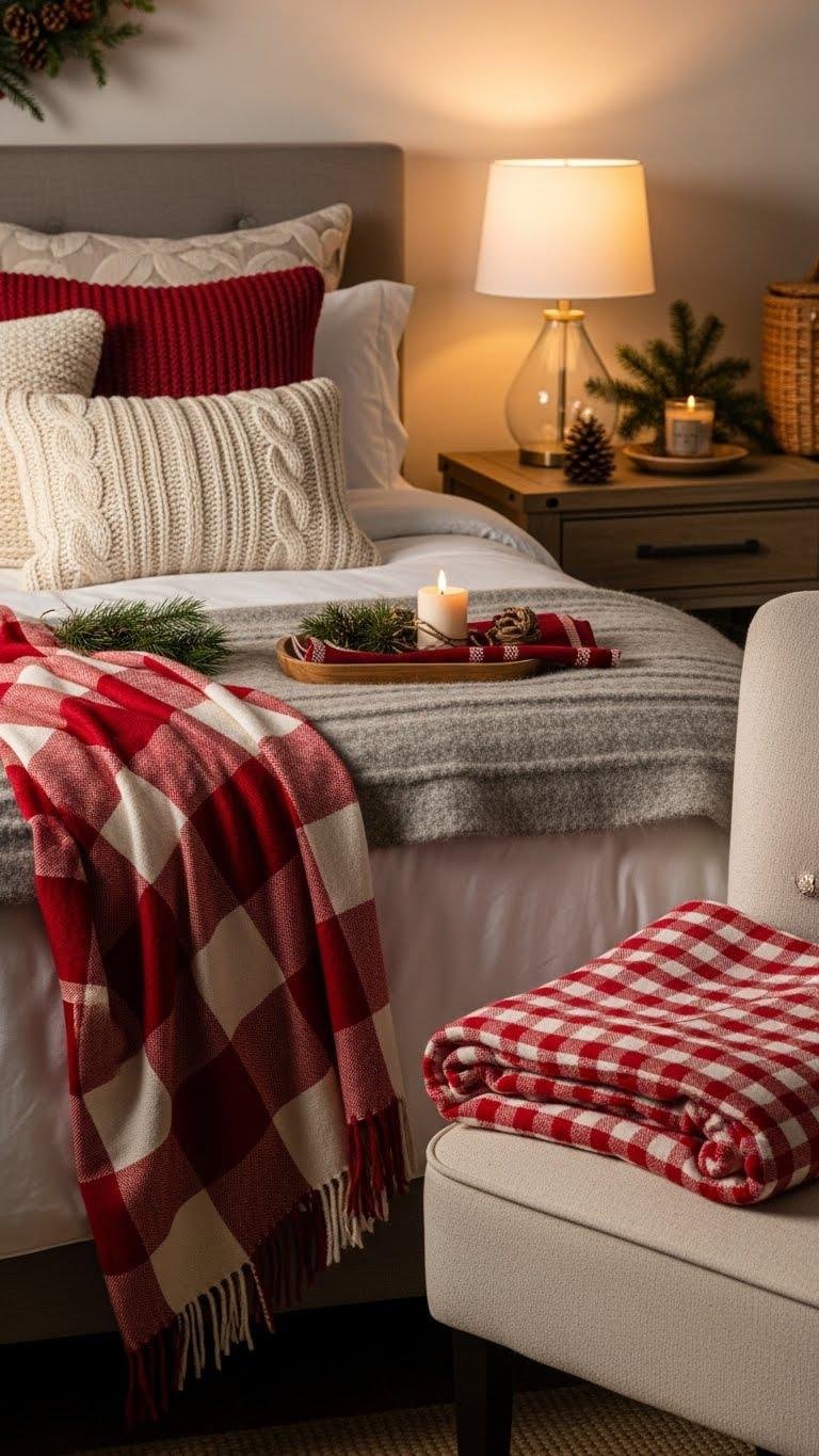 Bring a pop of timeless charm to your winter bedroom by draping red and white checked throws across the foot of the bed or over an accent chair— they instantly anchor the room with pattern and warmth. You’ll mix Holiday motifs with Picnic nostalgia for spirited contrast, layer textures for cozy function, and swap patterns easily so your space stays liberated, practical, and effortlessly festive.