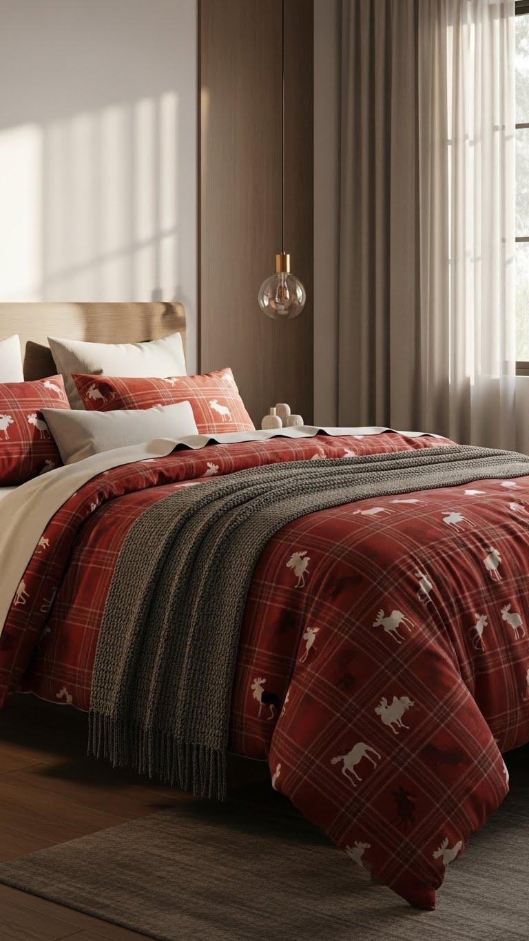 Slide in a red plaid or flannel moose duvet to instantly inject cozy, cabin-like character into your winter bedroom without undoing the neutral calm you’ve already built. You’ll embrace rustic charm and subtle woodland whimsy while keeping lines clean.