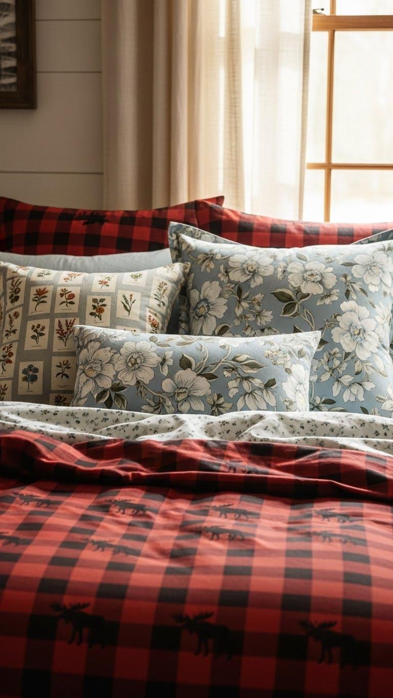 If you loved the warm, rustic energy of red plaid moose bedding, soften the look by adding floral pillows in light and blue tones to introduce a fresh, airy counterpoint. Choose soft blue and vintage botanical prints to layer texture and calm. Mix scale—small blooms with oversized motifs—so your space feels liberated, intentional, and effortlessly cozy without overpowering the room.