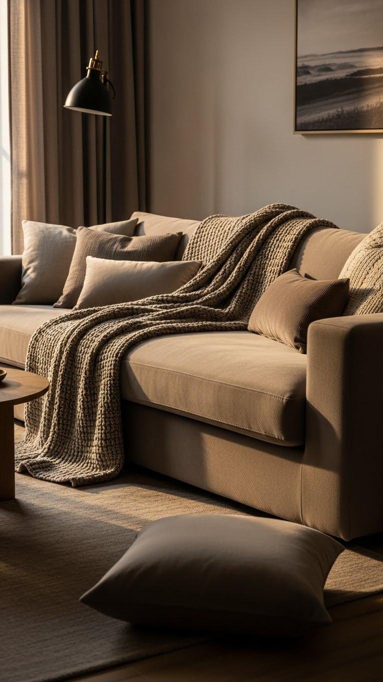 You’ll mix earthy textiles with layered throws, choose coffee tones for walls or rugs, and add walnut accents in furniture to ground rooms.