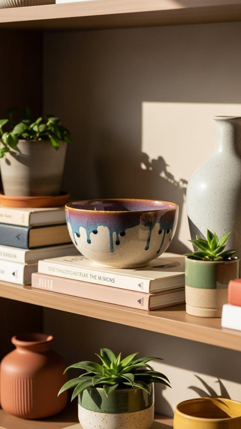 Pick up a single glazed bowl or matte vase and let it anchor a shelf grouping—pottery brings tactile warmth and an instant sense of story. You’ll mix matte stoneware with pieces showing reactive glaze, balancing scale and color.