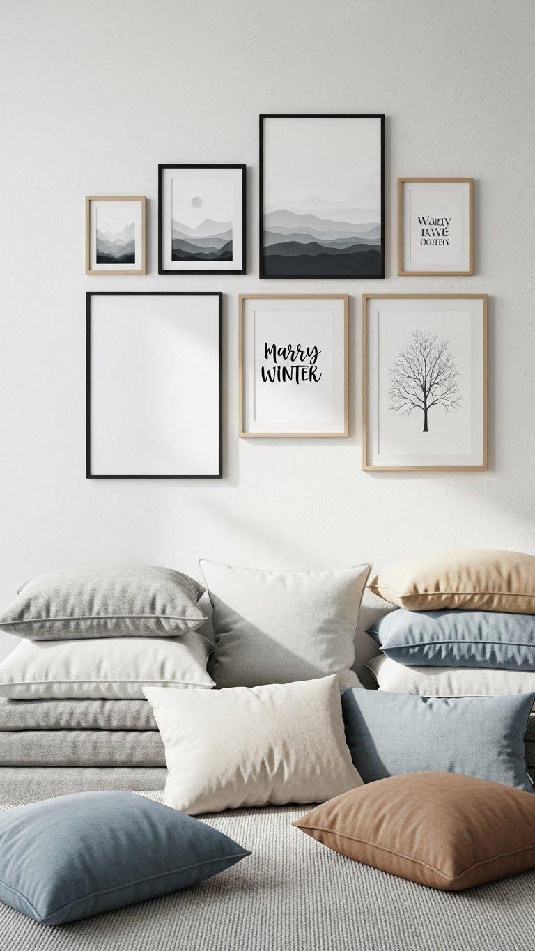 If you want your seating area to feel finished, hang custom winter wall art that echoes the textures and muted palette of your pillows and rugs.