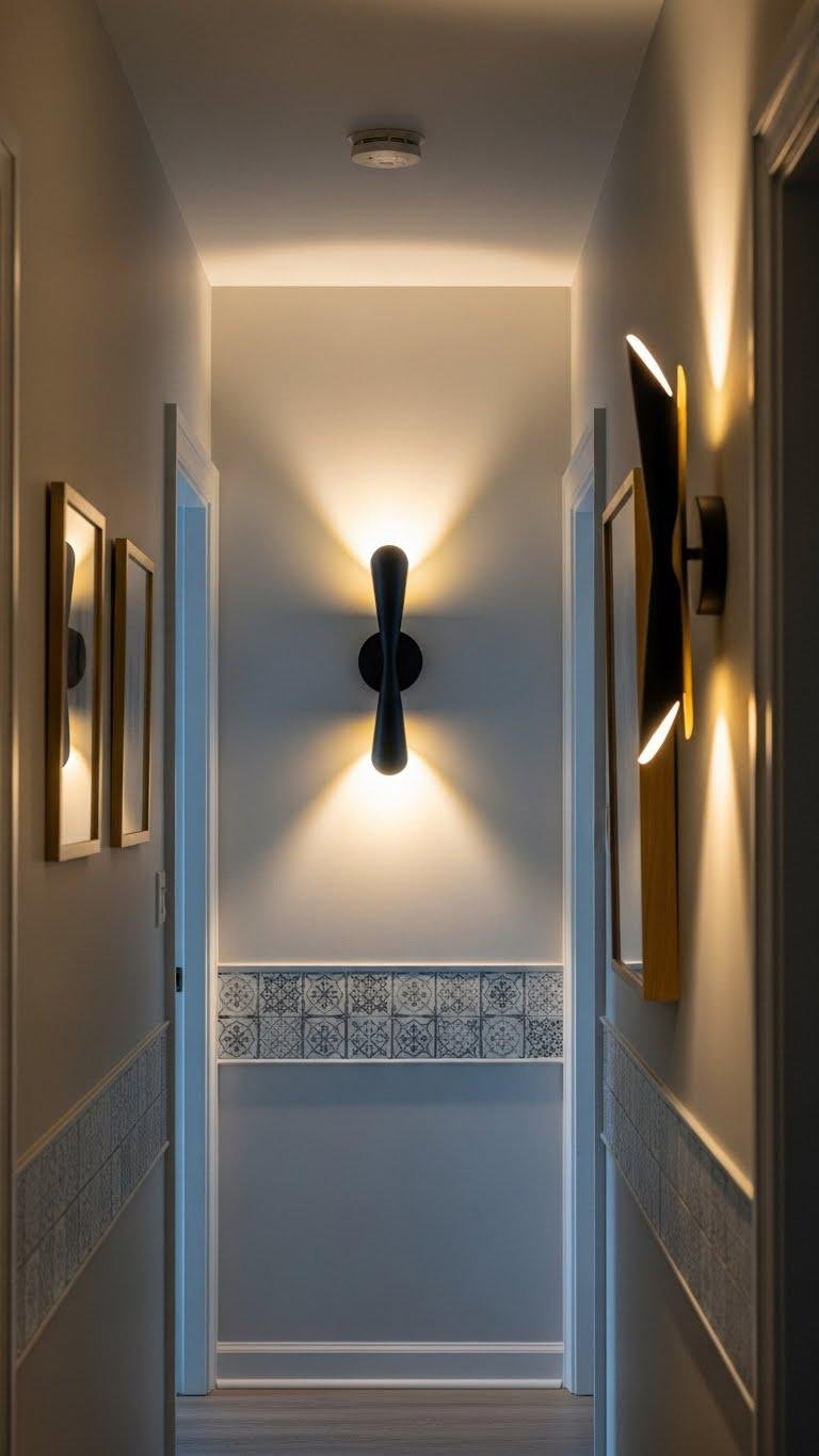 Choose sculptural sconces that cast tailored pools of light, highlighting hallway silhouettes and artwork. You’ll create movement and depth while keeping pathways clear. Opt for finishes and shapes that reflect your personal style and invite lingering.