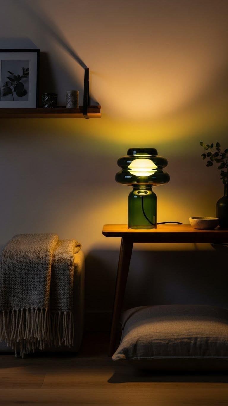 Often you’ll find that a single jewel‑like lamp can instantly transform an overlooked nook into a cozy, design-forward moment; place it on a slim side table or floating shelf to create layered light and a focal point.
