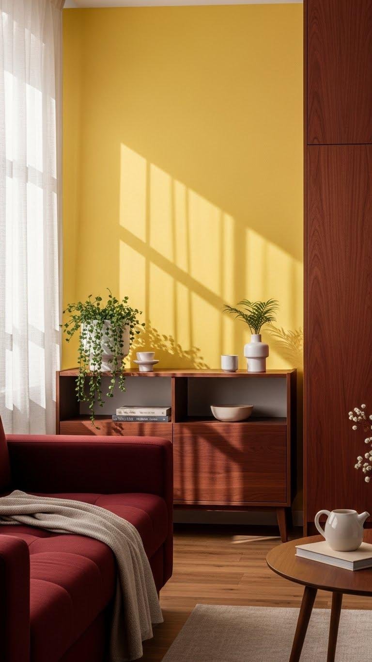 Choose a matte buttery accent finish for subtle texture, then balance with natural wood and airy linens. You’ll invite yellow warmth without overwhelming the space, keeping lines clean and freeing the room to feel cozy, optimistic, and effortlessly modern.