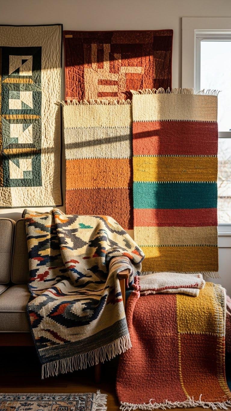 Layer woven tapestries and quilts to add instant warmth and handcrafted character to your space. You’ll drape a sculptural piece over a sofa, hang a quilt as art, or layer panels for depth. Follow woven panel care—gentle vacuuming, rotating, sun avoidance—and celebrate heirloom stitch stories by mixing vintage motifs with modern palettes for a liberated, cozy look.