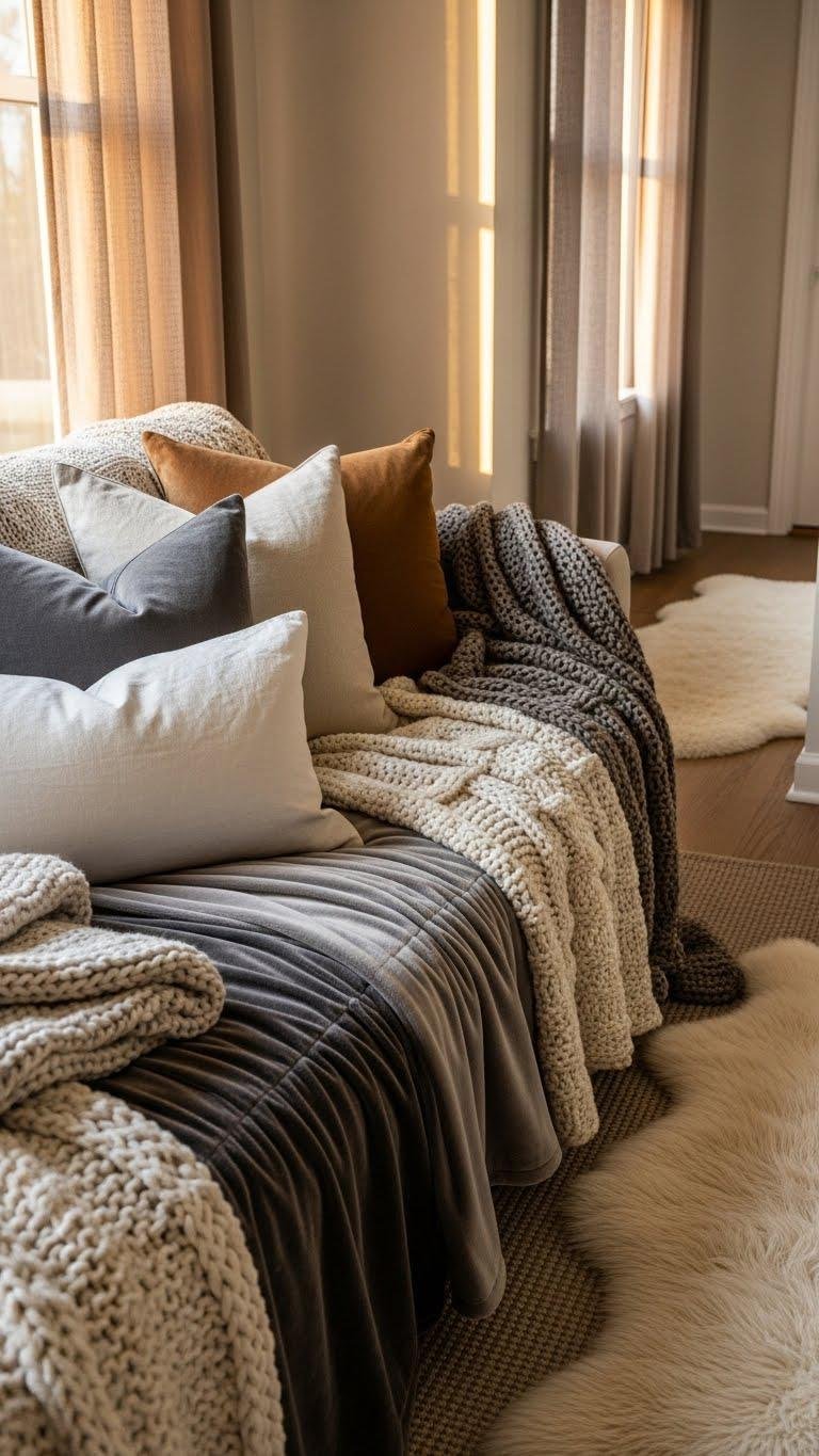 Start by piling on textures: mix chunky knit throws, crisp linen shams, and a velvety accent blanket to create instant warmth and visual depth. You’ll layer sheepskin runners along hallways and add thermal curtains to hold heat without feeling heavy. Choose neutral tones, contrast textures, and leave spaces that breathe — practical, liberating warmth that looks curated, not constrained.
