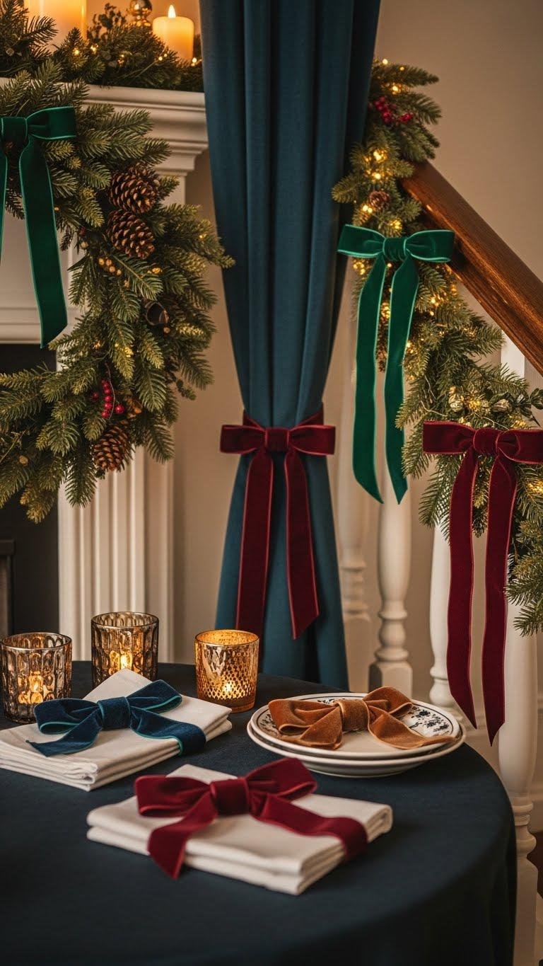 Soft velvet bows and ribbon accents elevate winter decor with an instant touch of luxe texture and vintage charm. You’ll tie velvet bowties on wreaths, napkins, and curtain ties to add sultry softness.