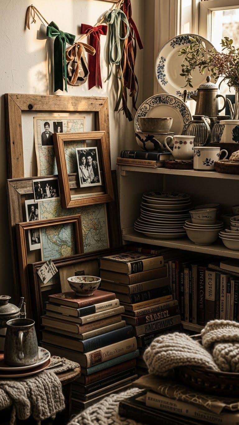 After you’ve tied velvet bows and draped ribbon garlands, hunt for thrifted pieces that add the lived-in depth your room needs. You’ll find rustic frames to showcase candid photos and maps, stacked books for texture, and mismatched china arranged on open shelving for charm. Mix patinaed metals and cozy textiles so each object feels intentional, free, and effortlessly layered.