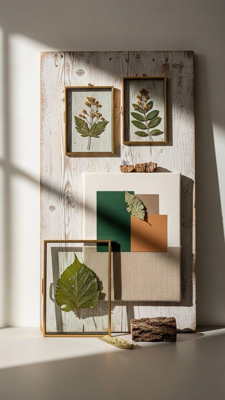 You can mount pressed botanicals on reclaimed panels, frame simple sketches, or combine rustic bark accents with minimalist canvases.