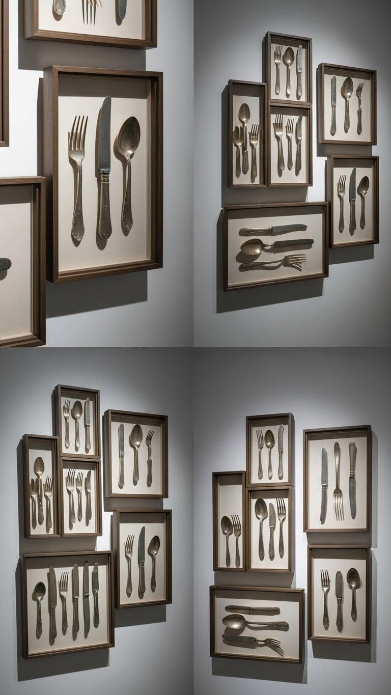 Give your walls a story by mounting vintage silverware as sculptural art — it turns inherited flatware into a striking focal point that blends history with modern design.