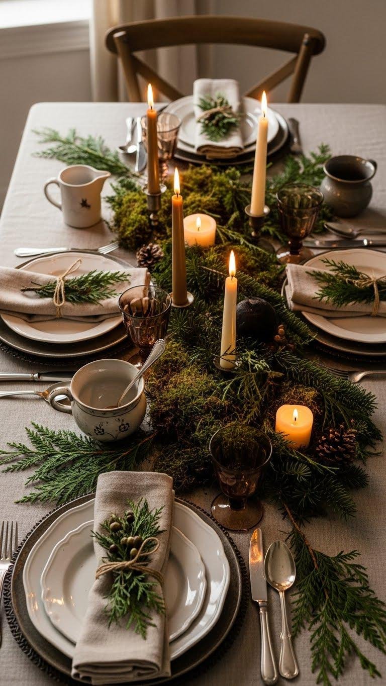 After you’ve set a table that feels like family — linen napkins, heirlooms, candlelight — add winter greens to deepen that lived-in warmth and anchor the room in nature. You’ll weave winter branchings through centerpieces, tuck sprigs into place settings, and craft low-profile moss tablescapes that feel wild yet curated. These touches free your space, grounding celebrations in seasonal calm and elegant simplicity.