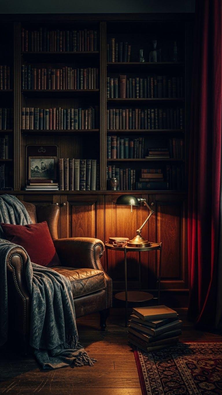 Often you’ll carve out a moody Dark Academia corner by layering rich textures, warm wood tones, and chiaroscuro lighting to create a studious, intimate atmosphere. You’ll arrange a moody study with book-lined shelves, a leather chair, brass accents, and soft throws. Add antique chandeliers or dimmed lamps to heighten focus and freedom — a private, scholarly refuge that feels intentionally lived-in.