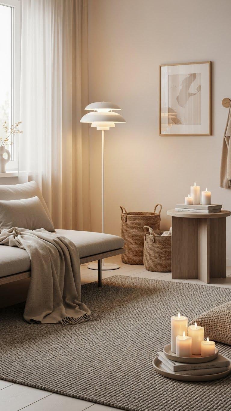 You’ll pair minimalist candles, woven baskets, and layered lighting to create calm, movable warmth that supports your freedom to rearrange and breathe in a lighter winter.