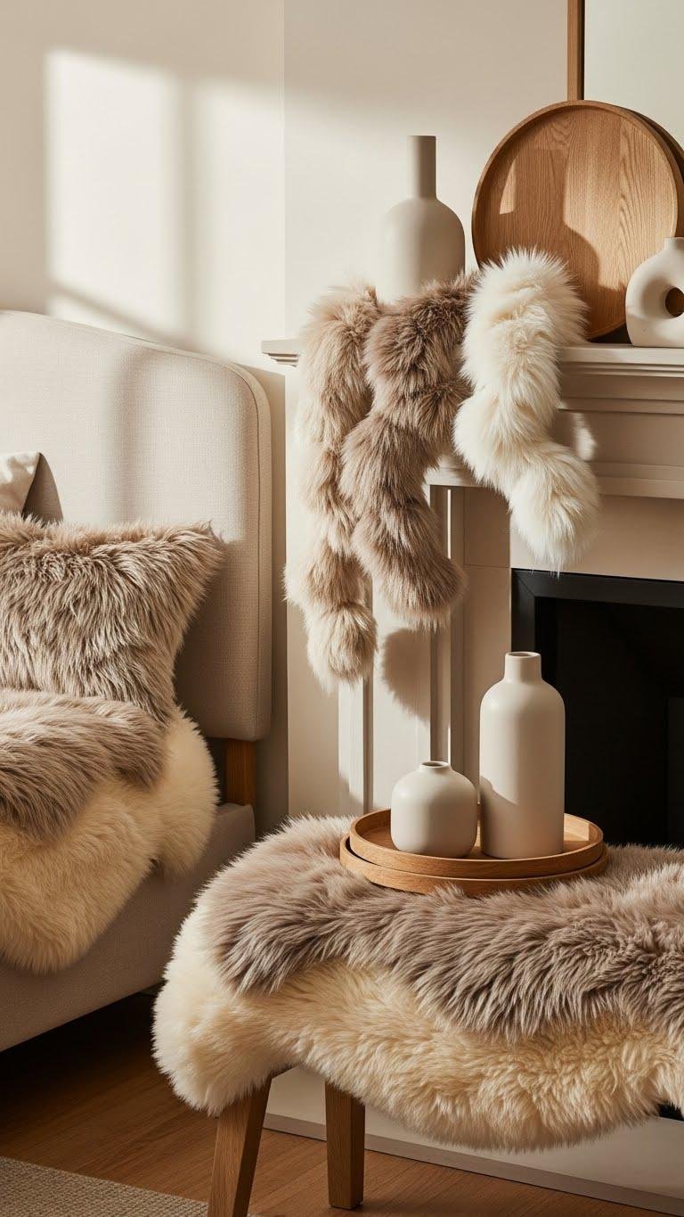 If you want a cozy, Scandinavian-inspired touch that still reads modern, drape faux fur garlands across mantels, shelves, or the headboard for instant warmth and texture.