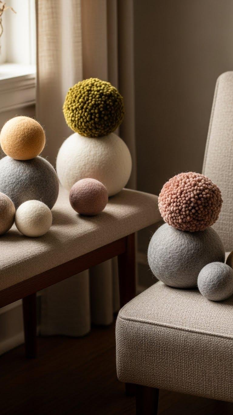 You’ll choose handfelted spheres to add organic texture and sculptural drama without bulk. Mix sizes and muted hues, or go bold with pompom clusters for playful contrast. They anchor a chair or bench, invite touch, and let you shape a calm, liberated winter niche that’s unmistakably yours.